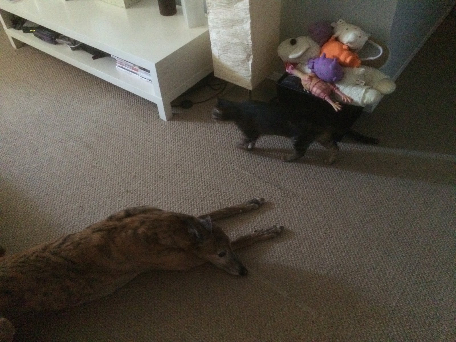 | First time being left alone - Auntie and Devin returned to find us snoozing in our respective places |